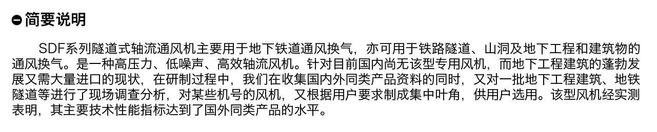 SDF系列隧道式軸流通風機主要用于地下鐵道通風換氣,亦可用于鐵路隧道、山洞及地下工程和建筑物的 通風換氣。 是一種高壓力、低噪聲、高效軸流風機。 該型風機經實測 表明,其主要技術性能指標達到了國外同類產品的水平。